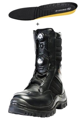 Suela bicomponente: Caucho – PU, entre suela poliuretano expanso, dureza 48 ±5 Shore A. Suela fabricada con caucho vulcanizado antideslizantes compuesto NBR dureza 65 ±5 Shore A, resistencia a la flexion de 150.000 ciclos y en la abrasión 130mm3.Resistente a temperaturas de hasta de 120ºC.