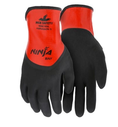 Material de recubrimiento nylon/Spandex calibre 18, completo de nitrilo color rojo con un segundo recubrimiento hasta los nudillo de BNF (nitrilo espumado transpirable) de color negro con recubrimiento NFT.